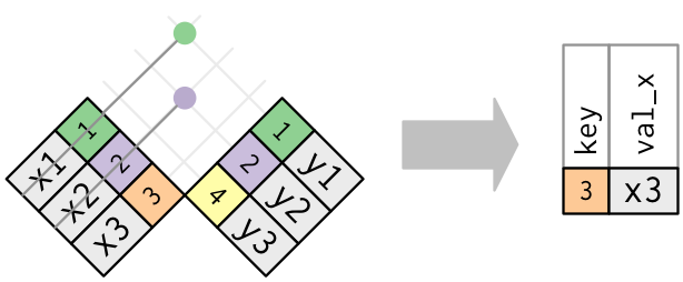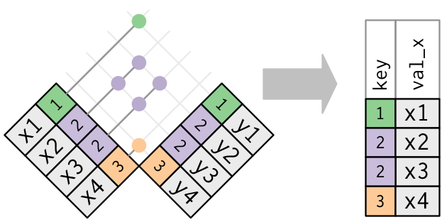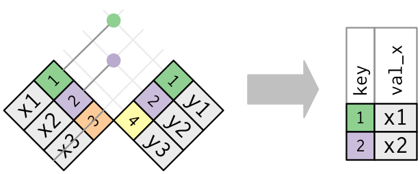 有颜色的列表示作为“键”的变量:它们用于在表间匹配行。灰色列表示“值”列,是与键对应的值。
