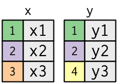 x 中的所有观测y 中的所有观测x 和 y 中的所有观测这些连接会向每个表中添加额外的“虚拟”观测,这个观测拥有总是匹配的键(如果没有其他键可匹配的话),其值则用 NA 来填充。