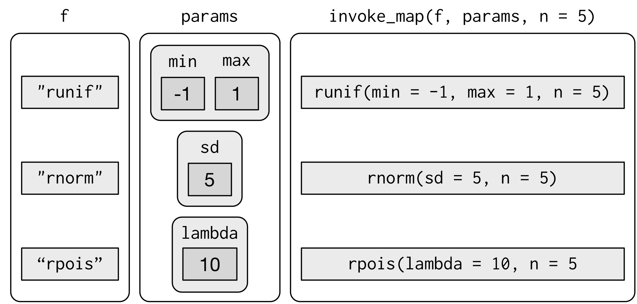 还有一种更复杂的情况:不但传给函数的参数不同,甚至函数本身也是不同的。为了处理这种情况,你可以使用 invoke_map() 函数: