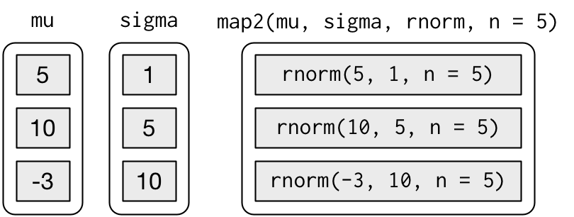 但是这种方法很难让人理解代码的本意。相反,我们应该使用 map2() 函数,它可以对两个向量进行同步迭代: