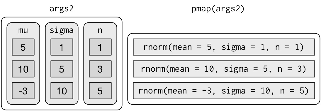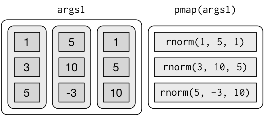 safely() 类似,possibly() 函数也总是会成功返回。它比 safely() 还要简单一些,因为可以设定出现错误时返回一个默认值:quietly() 函数与 safely() 的作用基本相同,但前者的结果中不包含错误对象,而是包含输出、消息和警告:迄今为止,我们的映射函数都是对单个输入进行映射。但我们经常会有多个相关的输入需要同步迭代,这就是 map2() 和 pmap() 函数的用武之地。例如,假设你想模拟几个均值不同的随机正态分布,我们已经知道了如何使用 map() 函数来完成这个任务: