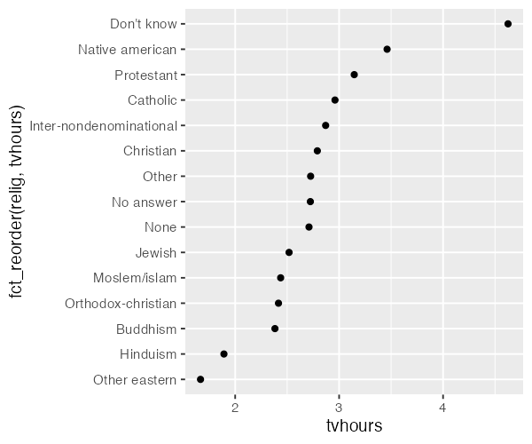 使用 forcats 包可以处理因子,这个包提供了能够处理分类变量的工具,还包括了处理因子的大量辅助函数。